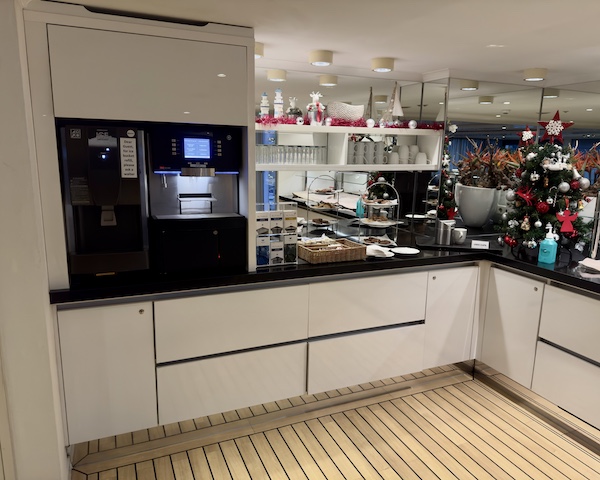 On the back of the boat, on the Upper Deck, you’ll find the ClubLounge. It’s a quiet lounge, perfect for reading or playing cards. Mark spent some time there, enjoying coffee and a treat, and found it was rarely used. It is stocked with a machine offering coffee drinks, hot water for tea, hot chocolate, and some cookies or snacks. And, as with everything else, the crew kept it impeccably clean and well-stocked.